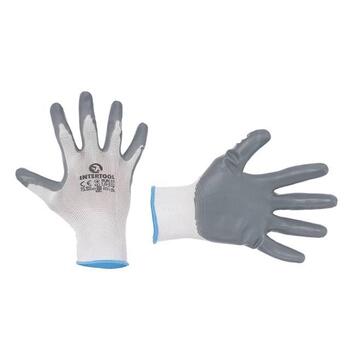 Долоні рукавиць вкриті сірим нітрилом для стійкого захисту рук від забруднень і механічних пошкоджень. При цьому рукавиці не сковують рухів пальців. Мають в'язаний манжет для фіксації на зап'ясті проти потрапляння всередину пилу і дрібних частинок.