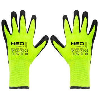 Утеплені робочі рукавички NEO розміру 9, нейлон з латексним покриттям, 4142X 97-613-9, виготовлені з нейлону з латексним покриттям. Вони мають високу стійкість до стирання (від 0 до 4) 4, стійкість до порізів гострими предметами (від 0 до 5) 1, стійкість до розриву (від 0 до 4) 4 та стійкість до проколу (від 0 до 4) 2. Вони також відрізняються стійкістю до порізів відповідно до EN ISO 13997 X. Рукавички добре сидять на руці. Вони можуть використовуватися для всіх видів транспортування, переміщення, зберігання, складальних робіт, виробництва дрібних деталей, DIY, автомобілебудування та садівництва. Вони захищають руки від холоду, бруду, подряпин, відбитків та шкідливих умов праці. При правильній конструкції - запобігає вислизанню інструментів з рук. Маркування CE на відповідність стандартам EN 388, 22242X та EN511, що забезпечує захист від холоду, є гарантією безпеки, що підтверджує, що продукт марки NEO відповідає всім вимогам СЕ.