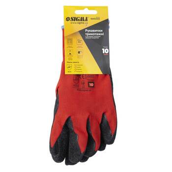 Рукавички трикотажні з частковим латексним спіненим покриттям р10 (чорні манжет) Sigma (9445581) призначені для захисту від механічних впливів, від порізів, проколів і мають хороше зчеплення як з сухими так і з вологими поверхнями.