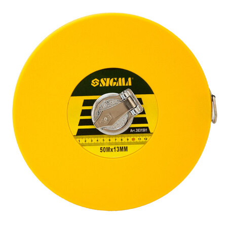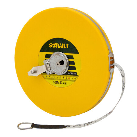 Рулетка скловолокно 50м×13мм SIGMA (3831501) - особливістю скловолоконних рулеток є можливість вимірювання великих відстаней за рахунок збільшеної міцності стрічки з низьким коефіцієнтом розтягування.