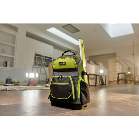 Рюкзак Ryobi 32х47х16.5 см. Максимальная нагрузка 20кг. Рассчитан на работу в тяжелых условиях независимо от того, работаете ли вы в пыльном помещении или после дождливого дня. Водонепроницаемое твердое дно из прочного полипропилена, идеально подходящее для работы на грязных влажных поверхностях. Оснащен внутренним отделением для ноутбука с мягкой подкладкой и регулируемым ремешком. Два внутренних закрывающихся кармана и один карман с молнией. Комплектуется двухсторонним органайзером для ручного инструмента. Рюкзак изготовлен из полиэстера 600 ден и имеет усиленные карманы из полиэстера плотностью 1680 ден, обеспечивающие в 3 раза больший срок службы и максимальную устойчивость к износу. Мягкие плечевые ремни обеспечивают максимальный комфорт во время транспортировки