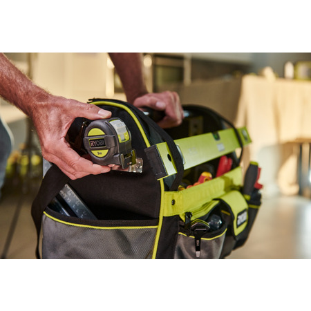 Карманы: 3 х внутренних петли для хранения инструмента, 5 х внутренних эластичных лямок, 1 х карман на молнии, 3 х наружных лицевых закрывающихся карманов, 4 х тыльных кармана, 1 х боковой карман с каждой стороны, 1 х держатель для рулетки. Большая вместительность, наплечный ремень и рукоятка из нержавеющей стали с эластичным покрытием обеспечивают максимальный комфорт во время транспортировки. Сумка для инструмента открытая большая, емкостью 38л. Рассчитана на работу в тяжелых условиях независимо от того, работаете ли вы в пыльном помещении или после дождливого дня. Имеет усиленные карманы из полиэстера плотностью 1680 ден, обеспечивающие в 3 раза больший срок службы и максимальную устойчивость к износу. Сумка изготовлена из материала плотностью 600 ден, что обеспечивает ее высокую долговечность. Водонепроницаемое твердое дно из прочного полипропилена, идеально подходящее для работы на грязных влажных поверхностях.