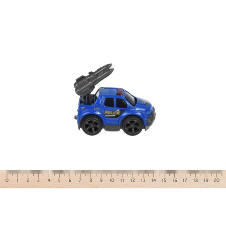 Вражаючий позашляховик для захопливих ігор. Синя машинка оснащена кулеметом. Іграшка виготовлена з пластику і металу. Виріб із інерційним механізмом. Розмір автомобіля 8х5х4,5см. Іграшка для дітей від трьох років.