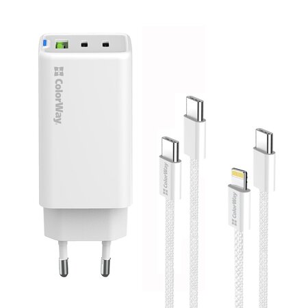 Сетевое зарядное устройство Colorway GaN Mini 65W PD Port PPS USB (USB-2C1A) – мощный, компактный и стильный адаптер, изготовленный из высококачественных материалов. Он поддерживает передовые технологии быстрой зарядки, в том числе Apple Fast Charge, PD 2.0&3.0 PPS 65W, Huawei FCP, Quick Charge 2.0/3.0/4.0+, Samsung SFC/AFC, и обеспечивает выходную мощность до 65 Вт. Такая мощность позволяет быстро заряжать не только компактные гаджеты, но и более энергоемкие устройства, такие как ноутбуки. Устройство имеет эргономичный дизайн, позволяющий одновременно заряжать до трех устройств. Интеллектуальная система управления адаптером автоматически определяет оптимальные настройки зарядки для каждого подключенного устройства. Он также оснащен надежными средствами защиты от превышения тока, скачков напряжения, коротких замыканий и перегрева, что обеспечивает его безопасность и долговечность. Благодаря использованию нитрида галлия (GaN) вместо кремниевых транзисторов этот адаптер обеспечивает высокую эффективность, снижение энергопотребления и минимальный нагрев во время работы. С зарядным устройством в комплекте идут два кабеля: Type-C – Type-C и Type-C – Lightning, обеспечивающие легкость подключения к разным устройствам.