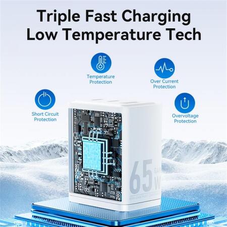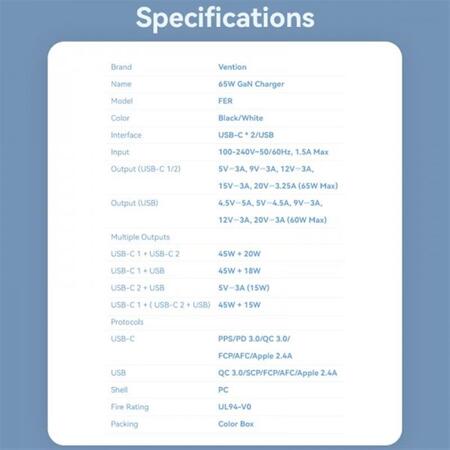 Представляем зарядное устройство Vention 65W GaN, компактное и эффективное решение для зарядки, разработанное для удовлетворения всех потребностей вашего устройства в питании. Это зарядное устройство, созданное с использованием новейшей технологии GaN (нитрид галлия), обеспечивает превосходную производительность при значительно меньшем форм-факторе. Ключевая особенность Высокая выходная мощность: это зарядное устройство поддерживает быструю зарядку Power Delivery (PD) мощностью 65 Вт, гарантируя быструю и эффективную зарядку ваших устройств. Идеально подходит для различных устройств, таких как планшеты, переключатели и телефоны. Эффективность двух портов: зарядное устройство Vention 65 Вт GaN, оснащенное портами USB-C и USB-A, позволяет заряжать два устройства одновременно. Благодаря общей выходной мощности вы можете повысить эффективность зарядки, как никогда раньше. Компактный дизайн: зарядное устройство GaN Vention на 53% меньше стандартных зарядных устройств мощностью 65 Вт, что делает его невероятно портативным. По своим размерам он сравним с камерой телефона, что позволяет легко заряжать его в пути. Технология низких температур. Благодаря передовой технологии низких температур это зарядное устройство обеспечивает безопасную защиту в режиме реального времени во время зарядки. Функции включают защиту от температуры, защиту от перенапряжения, огнестойкую защиту, защиту от перегрузки по току и защиту от короткого замыкания для круглосуточной безопасности. Совместимость: Это универсальное зарядное устройство совместимо с широким спектром устройств. Он подходит для iPhone серии 8–15, телефонов Android, планшетов, коммутаторов и многого другого. Эффективность зарядки 60 % всего за 28 минут для iPhone 14 Pro и 98 % за 60 минут для Samsung S22 — это действительно работает. Передовая технология GaN. Используя технологию нитрида GaN III, это зарядное устройство обеспечивает оптимальную производительность при меньшем выделении тепла и более эффективной подаче энергии, что делает его идеальным выбором как для личного, так и для профессионального использования.