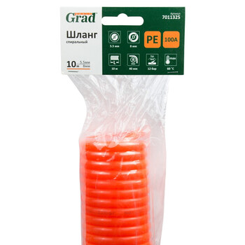 Шланг спіральний поліетиленовий (PЕ) 10м 5.5×8мм GRAD (7011325) використовується для передачі повітря в пневматичних системах стандартного тиску. Шланг не схильний до гідролізу і має хорошу стійкість до впливу озону і мікроорганізмів.