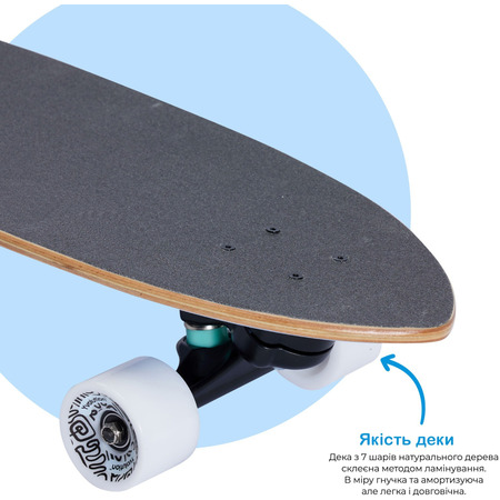 Дека оформлена в традиционной стилистике и выполнена по всем основным канонам скейтбординга и состоит из 7 слоев склеенного методом ламинирования натурального дерева. Благодаря такой конструкции она максимально надежна, в меру гибкая и амортизирующая, но легкая и долговечная.