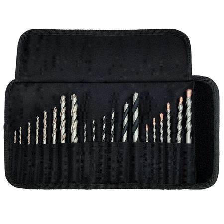 Свердло по металу з високосортної швидкорізальної сталі згідно з DIN 338, після роликового прокатування, циліндричне, праворізне, тип N, підходить для свердління сталі, кольорових металів, легованого і нелегованого сталевого литва. Опір розриву до 900 Н/мм². Свердло по каменю для звичайних і ударних дрилів; фрезероване виконання, твердосплавна пластина 130°, для свердління цегли, цегляної кладки, натурального каменю тощо. Свердло по дереву з високоякісної сталі, загартоване, з центрувальним вістрям. Для свердління твердих та м’яких порід деревини, фанери, ДСП тощо. 20 предметів, у складній сумці. Свердла по металу (HSS-G) 2 x Ø 3 x 62 /2 x Ø 4 x 62 / 1 x Ø 5 x 75 / 1 x Ø 6 x 92 / 1 x Ø 8 x 117/ 1 x Ø 10 x 135 мм; свердла по дереву 1 x Ø 3 x 62 / 4 x 74 / 5 x 85 / 6 x 92 / 8 x 117 / 10 x 133 мм; свердла по каменю 1 x Ø 3 x 60 / 4 x 75 / 5 x 85 / 6 x 100 / 8 x 120 / 10 x 120 мм.