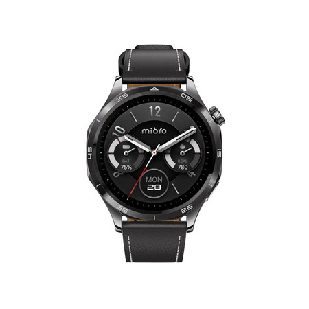 Корпус смарт-часов Mibro GT выполнен из нержавеющей стали 316L и армированного полимера в темном металлическом оттенке, с диаметром 46 мм и толщиной 11.56 мм. Основной ремешок из кожи весит 57.4 г вместе с корпусом, а дополнительный силиконовый – 63.7 г. Ремешки шириной 22 мм заменяются просто, а влагозащита 5 ATM поддерживает активность в воде.