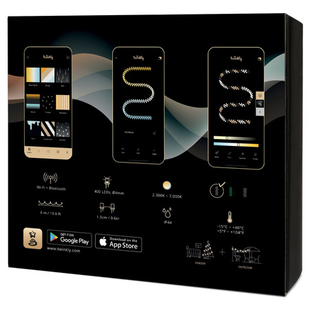 Twinkly - особо эффектные премиум гирлянды, управляемые как кнопкой на гирлянде, так и из мобильного приложения Twinkly в них каждый светодиод управляется программой отдельно ради великолепных эффектов. Мобильное приложение элегантно и легко отображают эффекты и анимацию на выбранном объекте расположения гирлянды. Twinkly предлагает набор эффектов, готовых для моментального отображения. Каждый из эффектов можно модифицировать или создать полностью свой. Голосовое управления Google Assistant и Amazon Alexa (пока лишь на англ языке) разнообразит управление гирляндой. С помощью аксессуара Twinkly Music Dongle (приобретается отдельно) световые эффекты синхронизируются с музыкой. Разные гирлянды Тwinkly могут быть легко объединены в одну синхронно светящуюся группу. Гирлянды Twinkly разработаны как для внутреннего, так и для наружного (стандарту IP44) использования.