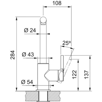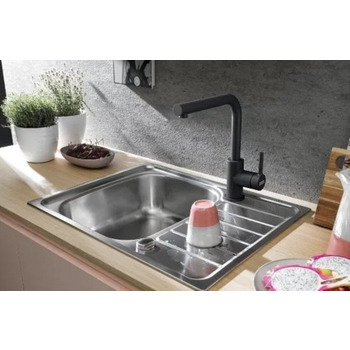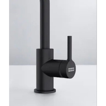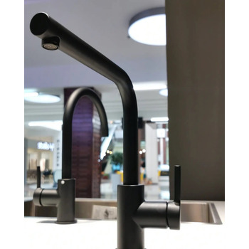 Однорычажный смеситель L-образной формы изливом, который вращается на 360 градусов и оснащен боковым рычагом управления.