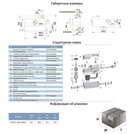 Компактна автоматична каналізаційна установка оснащена насосом з ріжучим механізмом і призначена для перекачування побутових стічних вод під тиском з житлових приміщень (туалетів, умивальників, ванн, душових кабін, пральних і посудомийних машин), де вони не можуть відводитися в каналізаційну систему самопливом. Каналізаційна станція не повинна перекачувати: агресивні хімікати і розчинники, пластикові вироби, предмети особистої гігієни, металеві предмети, будівельний матеріал і т.д.