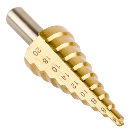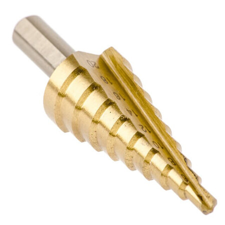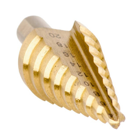 Свердло має конічну форму, з зростаючим діаметром на 2 мм за крок. Ріжучі кромки виготовлені з HSS сталі, ефективно справляються зі своєю роботою та довго залишаються гострими. При необхідності свердло можна заточити.