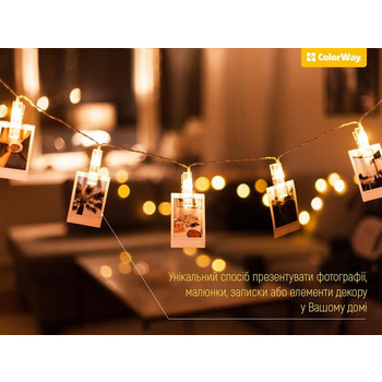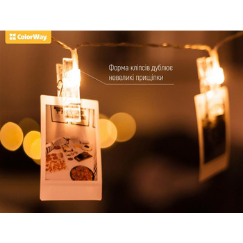 LED photo clip – это 3м для Вашего творчества. Форма клипов полностью дублирует небольшие прищепки, которые соединены прозрачным тонким проводом. Дизайн светодиодных зажимов дарит воздушность и минимализм с приятным теплым свечением. Миниатюрный блок питания (для 3-х батареек типа АА) обеспечивает автономность и мобильность. Данная прядь огней - это уникальный способ презентовать фотографии, рисунки, записки или элементы декора в Вашем доме. Достаточно просто закрепить их на прищепки, чтобы осветить яркие воспоминания и создать уютную атмосферу. Также светодиодная гирлянда станет отличным дополнением к интерьеру дома: гостиной, спальни, крыльца или Вашего сада. Особенно уместно она будет смотреться на зимней красавице – ёлке, ведь поможет создать уникальный новогодний наряд. Идеально подходит для декора летних террас, кафе, витрин магазинов, выездных мероприятий. Светодиодные зажимы добавят атмосферности Вашим праздникам и особым случаям благодаря приятной мягкости теплого свечения.