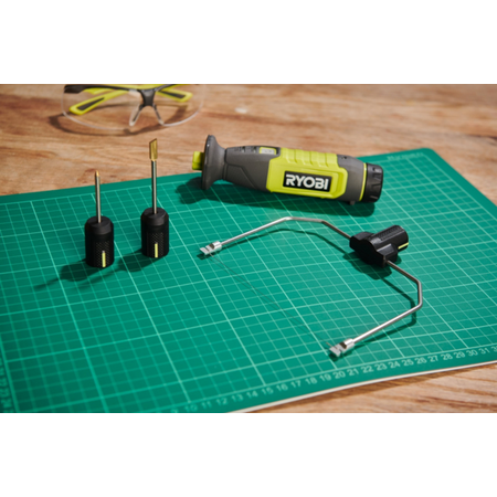 Термоніж Ryobi RHC4-120G - це акумуляторний термоніж з можливістю підключення до USB. Він працює від літій-іонного акумулятора напругою 4В. Цей термоніж може бути корисним інструментом для роботи в умовах, коли потрібно швидко нагріти або розігріти які-небудь предмети, підклеювати плівку або робити інші подібні роботи.