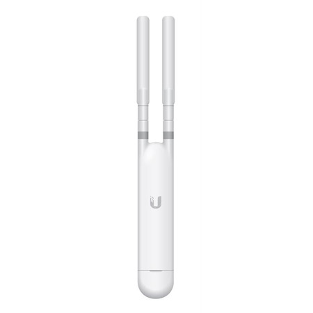 Длинна корпуса UniFi ac Mesh составляет всего лишь 20 см. Устройство имеет две съемные антенны, привинчивающиеся к разъемам расположенным сверху корпуса. Несмотря на компактность UniFi Mesh получила мощную двухдиапазонную радиочасть с независимыми модулями, позволяющую использовать одновременна обе полосы частот. При этом обеспечивается пропускная способность до 300 мб/сек для диапазона 2.4 Ггц, на котором нет поддержки новейшего WiFi 802.11 ac и до 867 мб/сек в диапазоне 5 ггц с использованием стандартов 802.11 ac. Использованная в UniFi Mesh антенная кофигурация – это хорошо знакомая всем классическая схема MIMO 2X2, с двумя пространственными потоками передачи данных. Дальность действия точки доступа достигает 183 метров.