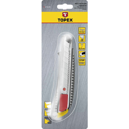 Ніж з лезом, що відламуються TOPEX для роботи з лезами шириною 18 мм. Призначений для виконання механічних робіт, а також робіт, які виконуються майстрами-аматорами. Металева спрямовуюча і корпус забезпечують довгий термін служби. Завдяки антиковзаючому матеріалу і ергономічній формі ніж добре лягає в долоню, що забезпечує безпеку і комфорт при експлуатації. Бренд TOPEX призначений для домашніх майстрів.