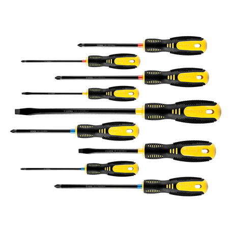 Набор отверток TOPEX предназначен для выполнения механических работ, а также работ, выполняемых мастерами-любителями. Стержень каждой из девять отверток изготовлен из прочной хромомолибденовой стали, обеспечивающей долгий срок службы инструмента. Магнитное жало из закаленной стали облегчает работу с инструментом. Эргономичная пластмассовая рукоятка, покрытая антискользящим материалом, обеспечивает комфорт и безопасность во время работы. Бренд TOPEX предназначен для домашних мастеров.