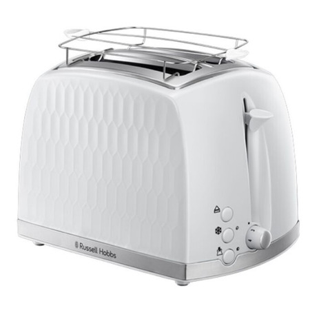 Тостер Russell Hobbs 26060-56 із серії Honeycomb має елегантний текстурований дизайн, не має гострих кутів. Як матеріал використовувався високоякісний білий пластик із хромованими вставками. Потужність тостера становить 850 Вт, що дає змогу швидко та легко готувати смачні тости. Піддон для крихт входить до комплекту, тому стіл завжди залишатиметься чистим, після приготування ароматних тостів. Прогумовані ніжки стійко фіксують прилад на поверхні столу та не пошкоджують її.