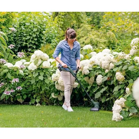 - Режущая головка диаметром 23 см для эффективной обрезки травы и кустов.