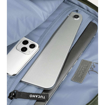 Спортивный рюкзак Tucano Ted 14 для ежедневного использования с вместительным центральным отделением и отдельными карманами для ноутбука 14 дюймов, а так же для планшета 10 дюймов, и ещё одним карманом для аксессуаров спереди. На спинке есть защитный карман на молнии и ремешок для фиксации рюкзака на телескопической ручке чемодана.