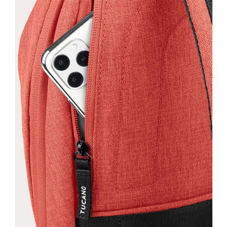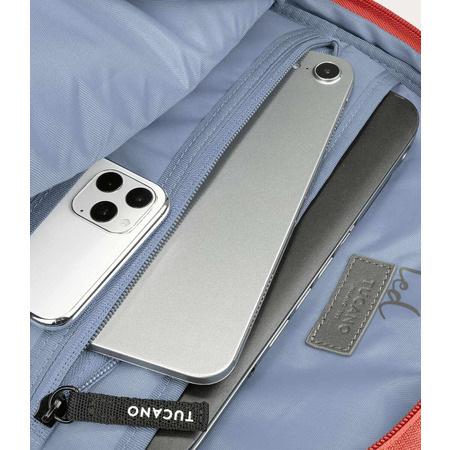 Спортивный рюкзак Tucano Ted 14 для ежедневного использования с вместительным центральным отделением и отдельными карманами для ноутбука 14 дюймов, а так же для планшета 10 дюймов, и ещё одним карманом для аксессуаров спереди. На спинке есть защитный карман на молнии и ремешок для фиксации рюкзака на телескопической ручке чемодана.