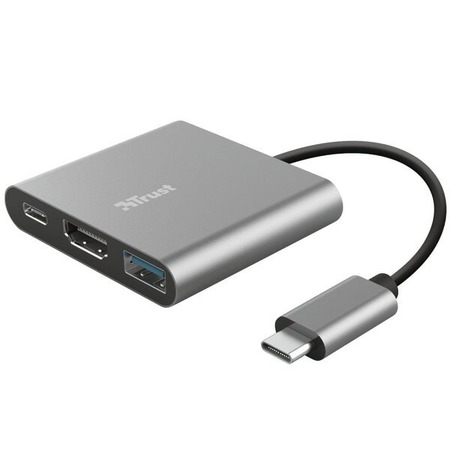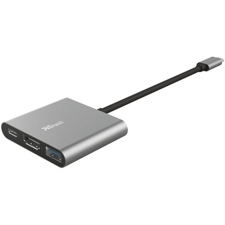 Стильный адаптер USB-C 3-в-1 в алюминиевом корпусе с портами USB и HDMI, а также портом Type-C для зарядки ноутбука.
