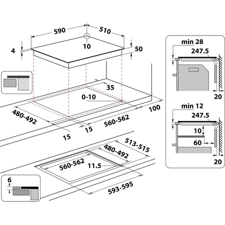 – Установка возможна даже на очень тонкие столешницы. Минимальная необходимая толщина столешницы составляет 12 мм для установки без духовки или 28 мм для установки над духовкой.