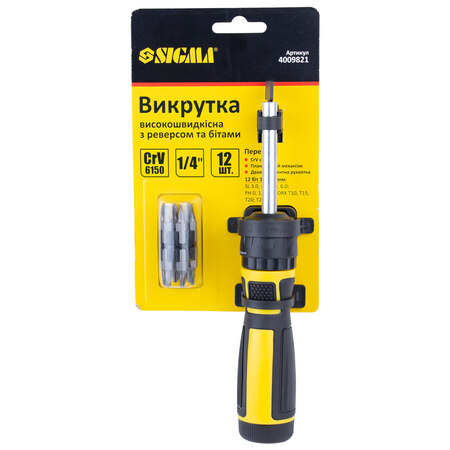 Викрутка з реверсом високошвидкісна + біти 12шт CrV Mega Sigma (4009821) - для монтажу і демонтажу різьбових з'єднань. Викрутка з храповим механізмом ( «тріскачкою»), завдяки якому стрижень з наконечником вільно прокручується в рукоятці в одному напрямку. Така конструкція дозволяє працювати викруткою однієї рукою, не перехоплюючи рукоятку. Залежно від виконуваних функцій (відгвинчування або загвинчування) потрібно змінити напрямок прокручування стрижня. Механізм хропіння забезпечується для цього перемикачем, виконуваних у вигляді важеля, ползункового перемикача або муфти. Середнє положення перемикача блокує обертання стержня в рукоятці.