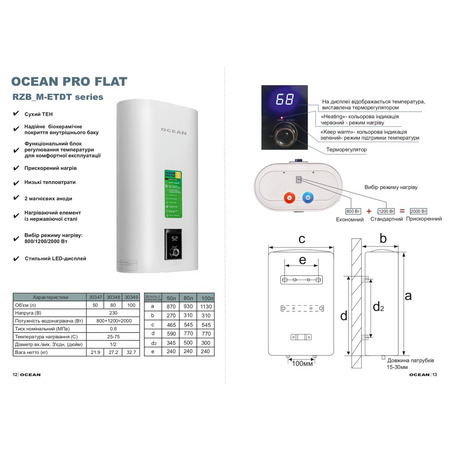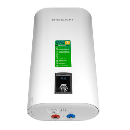 Водонагрівач OCEAN FLAT ідеальне рішення автономно організувати подання гарячої води! Водонагрівачі OCEAN; використовуються як для домашнього (квартира, заміський будинок, дача), так і для громадського користування (бари, ресторани, сауни, офіс та ін.). Основною перевагою накопичувального електронагрівача є його здатність забезпечити гарячою водою відразу кілька точок водозабору. Компактне рішення для невеликих приміщень, елегантний, сучасний дизайн! Моделі серії FLAT мають плоску, прямокутну форму. Основною перевагою цих моделей є компактний плоский корпус завглибшки 24-29 сантиметрів за об'єму 50-100 літрів, а також швидке нагрівання води. Невелика споживана потужність (2.0 кВт) і можливість під'єднати бойлер до 1-фазної електромережі, що особливо важливо для міських квартир, що мають обмеження в споживанні (за потужністю) електроенергії. Економний у витратах на електроенергію: в разі нагрівання води до заданої температури, термостат вимикає водонагрівач від мережі. Вкрай низькі теплові втрати через корпус бойлера дають змогу зберігати воду гарячою цілу добу. Це досягається ефективною теплоізоляцією пінополіуретаном зі щільністю 36 кг/см. Товщина стінки корпусу бака (s = 2.0 мм). Зазначимо, що у 90% інших виробників товщина стінок бака становить s = 1.2.5 мм. Товщина стінок стає основним чинником, що впливає на термін експлуатації бойлера, визначає його довговічність Внутрішній бак має особливо міцне та стабільне емалеве покриття. Під час нанесення на метал емаль обпалюється за температури 1000, що забезпечує захист металу від проникнення води та розвитку корозії На одному фланці встановлені 2 автономні ТЕНи. Потужність нагрівального елементу 2.0 (1.2 + 0.8) кВт. Обидва ТЕНи можуть працювати як по черзі, так і одночасно. Одиничний режим дає змогу домогтися економного, але тривалішого нагрівання води, у той час, як два ТЕНи, що працюють, швидше нагрівають воду. Термостат із захистом від перегрівання вимкне живлення бойлера в разі перевищення температурного режиму Всі моделі обладнані регулятором потужності, що дає змогу вибрати один із трьох режимів нагрівання, а також режим економного нагрівання. Двополюсний вимикач для вибору режиму роботи ТЕНів: положення ТЕНи вимкнені, положення ввімкнений перший ТЕН (0.8 кВт), положення ввімкнений другий ТЕН (1.2 кВт), положення 2 + 1 ввімкнені обидва ТЕНи Внизу на приладовій панелі розміщена поворотна ручка термостата. З її допомогою можна задати такі температурні режими нагрівання води: нагрівання води вимкнене; підтримується температура приблизно 20 C, режим антизамерзання води всередині баків за температури навколишнього повітря не нижче ніж +5 C. Якщо температура повітря опускається нижче ніж +1 C, то необхідно злити воду з водопровідної системи та водонагрівача, щоб уникнути їх пошкоджень; З допомогою поворотної ручки вибирається потрібна температура нагрівання води: 40-50 C режим заощадження електроенергії, за його використання продуктивність на виході гарячої води зменшується. Цей режим використовується за невеликого об'єму споживаної гарячої води, а також для запобігання опіку гарячою водою. Температура 70-80 градусів максимальний нагрів і продуктивність на виході гарячої води. Цей режим використовується у разі великого об'єму споживаної гарячої води. На передній панелі корпусу бойлера є світлова індикаці