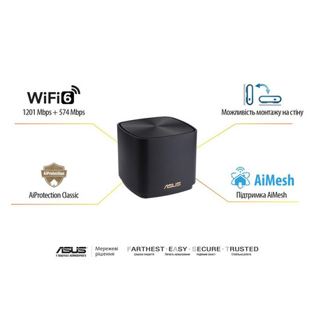 Mesh система ZenWiFi XD4 Plus состоит из трех узлов, каждый из которых является беспроводным маршрутизатором ASUS класса AX1800 (стандарт Wi-Fi 6). Доступны разные варианты подключения узлов друг к другу, вместе они обеспечивают покрытие скоростной, надежной и защищенной сетью Wi-Fi всего пространства дома.