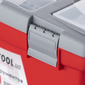 Ящик для інструмента BX-0416 INTERTOOL – ящик для зберігання і безпечного транспортування інструмента. Ящик виготовлений з міцного пластика, має міцну ручку для його носіння і стійкий до зовнішніх механічних впливів. Ящик має пластикові замки і додаткові пластикові бокси на кришці. Два бокса – знімні, необхідні для зберігання дрібних деталей, витратних матеріалів і т. ін. А третій бокс, розташований у передній частині кришке ящика має додаткові отвори для біт (викруткових насадок), головок. Габаритні розміри ящика BX-0416 - 415*210*190 мм.