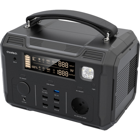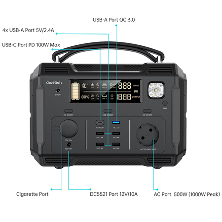 Компания Choetech создала для вас способ никогда не разряжать аккумулятор и всегда оставаться на связи. Наша портативная электростанция мощностью 500 Вт использует чистую синусоидальную технологию, которая безопасно питает электронные устройства и обеспечивает бесперебойное электричество, такое же надежное и безопасное, как электроэнергия, которую вы получаете дома от сети. Оснащена всеми необходимыми портами для зарядки ваших устройств и приборов, а также удобной кожаной ручкой.ВНИМАНИЕПодключать выход переменного тока портативной зарядной станции к розетке бытовой электросети строго запрещено. Такая эксплуатация устройства является опасной для вашей жизни, может нанести вред вашему здоровью, нарушить пожарную безопасность, а также может привести к поломке зарядной станции. Гарантийная политика не распространяется на неисправность устройства, вызванную ненадлежащим использованием.Мощный многопортовый генератор мощностью 500 ВтЭта портативная электростанция мощностью 500 Вт оснащена входом/выходом переменного тока, входом/выходом постоянного тока, портом QC3.0 USB-A, четырьмя портами USB-A 5 В/2,4 А, одним портом USB-C PD мощностью 100 Вт портом прикуривателя. Это портативная универсальная электростанция, которая удовлетворит любые потребности: зарядите ноутбук, мини-холодильник, дрон и другую уличную электронику во время похода.Экологическое источник питанияЭкологически чистая электростанция использует чистую синусоидальную технологию, которая безопасно питает электронные устройства, обеспечивая стабильное электричество, которое так же надежно и безопасно, как и электроэнергия, которую вы получаете дома. Не требует топлива и может быть легко заряжена солнечной панелью, обеспечивая и сохраняя бесплатную и экологически чистую энергию. Работает тихо, без выбросов газов.Эффективный солнечный генераторЭту электростанцию можно заряжать двумя способами: аккумулятор можно полностью зарядить с помощью солнечной панели (не входит в комплект) или постоянного тока. Вы можете использовать эту электростанцию как аварийный/резервный источник питания для вашего телефона, небольшого вентилятора, ноутбука, радио и т. д.Готов к отдыху на свежем воздухеЭргономичный дизайн с удобной ручкой для переноски. Берите с собой этот резервный аккумулятор, куда бы вы ни отправились: находитесь вы на свежем воздухе или в пределах своего дома, мы создали для вас способ, чтобы вы никогда не разряжались и оставались на связи.Конструкция военного классаБоковой корпус из алюминиевого сплава и материал ABS укрепляют края, удобная ручка и противоскользящий коврик на дне предотвращают повреждение устройства. Электростанция имеет встроенную защиту от перегрузки по току, перенапряжения и перегрева, что обеспечивает сохранность ваших устройств.Необходимый для путешествийИмеет порты AC/DC/USB: вход/выход переменного тока, вход/выход постоянного тока, порт USB-A QC3.0, четыре порта USB-A 5 В/2.4 А, один порт USB-C PD мощностью 100 Вт и порт прикуривателя. Электрогенератор можно использовать в помещении или на улице: дома, в офисе, во время путешествий или кемпинга и т. д. Зарядите его и положите в багажник автомобиля.Портативный источник питанияОснащен удобной ручкой и идеально подходит для путешествий: он идеально поместится в вашем рюкзаке или на заднем сидении во время