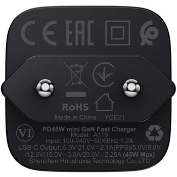USB-C: 5В/3А, 9В/3А, 12В/3А, 15В/3А, 20В/2.25 А – макс. 45 Вт (PPS/PD3.0/PD2.0/QC4+/QC3.0/QC2.0/AFC/FCP/SCP)