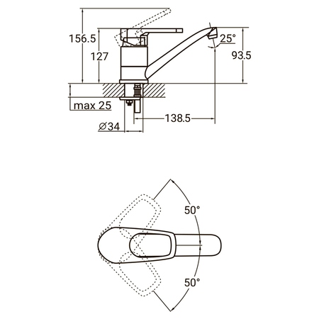 Тип кріплення до поверхні - фіксація шпильками. Підключення до водопроводу здійснюється за допомогою гнучких підведень, які йдуть в комплекті з кухонним краном.