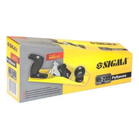 Міцна конструкція металевого корпусу рубанка 45×235мм SIGMA (4405111) пофарбована фарбою, тому не схильна до деформації та корозії. Загартований ніж зі швидкорізальної сталі (твердість 50-60 HRC). Плоский робочої поверхні. Конструкція має механізм автоматичного центрування ножа. Застосовується для стругання дерева.