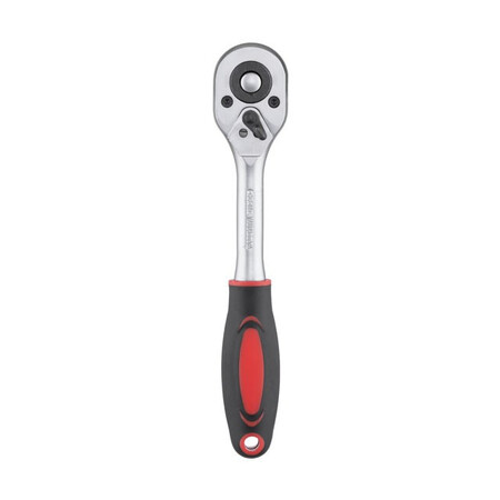 Двокомпонентна ручка з гумовими вставками гарантує надійне зчеплення навіть із брудними або забрудненими в мастилі руками. Міцна, зручна тріскачка комфортно лежить у долоні під час роботи.