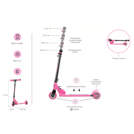 Складна конструкція/Неонові колеса/Міцна і легка рама/Висота керма регулюється