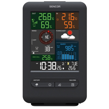 максимальные/минимальные записи памяти с отметками времени и даты; солнечная панель для автоматической регулировки яркости подсветки; передача между основным блоком и датчиком /до 150 м (на открытой местности); цветной дисплей /с диагональю 5,4 дюйма (13.