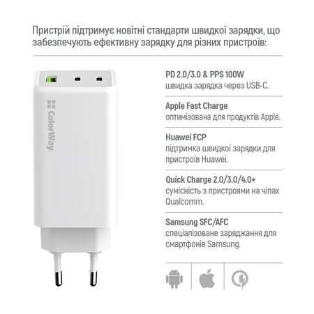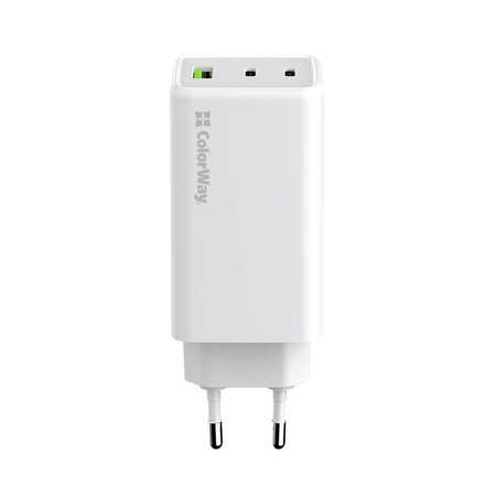 Мережевий зарядний пристрій Colorway GaN Mini 100W PD Port PPS USB (USB-2C1A) — потужний адаптер, оснащений одним USB портом для швидкої зарядки Quick Charge 3.0/4.0 і двома USB-C портами, які підтримують протоколи PD (Power Delivery) 2.0/3.0, 100W PPS, BC1.2 DCP 5V-1.5A; APPLE 5V-2.4A; APPLE FAST CHARGE; SAMSUNG 5V-2A/AFC/SFC; QC2.0/3.0/4.0+; HUAWEI FCP/SCP, VOOC. Цей інтелектуальний зарядний пристрій здатний безпечно та швидко заряджати до трьох мобільних пристроїв одночасно, включаючи смартфони, планшети, зовнішні батареї та інші гаджети. Завдяки використанню нітриду галію замість кремнієвих транзисторів, адаптер майже не нагрівається, споживає менше енергії та заряджає гаджети швидше, ніж звичайні пристрої. Мікросхема USB Auto ID автоматично визначає тип підключеного пристрою та регулює напругу і силу струму, забезпечуючи високу сумісність і швидкість зарядки для пристроїв різних брендів. Потужність 100 Вт дозволяє заряджати не лише мобільні пристрої, але й енергоємні ноутбуки. Пристрій оснащений системою захисту від перенапруги, перевантаження, короткого замикання та перегріву.
