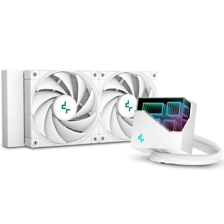 Високопродуктивний рідинний процесорний кулер DeepCool LT520 WH забезпечує потужне розсіювання тепла завдяки 240-міліметровому радіатору, двом точно налаштованим вентиляторам FK120 і багатовимірній безкінечній дзеркальній верхній кришкі, представленій у чистому повністю білому дизайні.