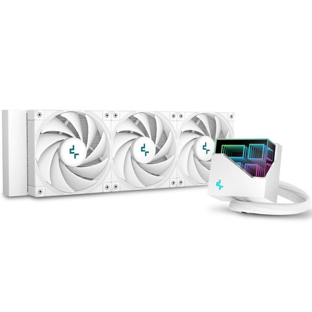 Високопродуктивний рідинний процесорний кулер DeepCool LT720 WH забезпечує потужне розсіювання тепла завдяки 360-міліметровому радіатору, трьом точно налаштованим вентиляторам FK120 і багатовимірній нескінченній дзеркальній верхній кришкі, представленій у чистому повністю білому дизайні.