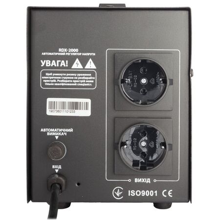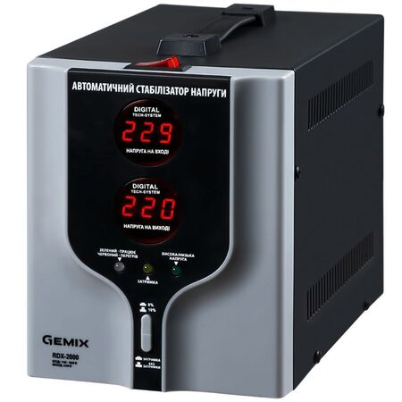Gemix RDX-2000 - автоматичний стабілізатор напруги, однофазний, релейного типу. Призначений для забезпечення стабільного електроживлення та захисту побутового обладнання (електронасосів, комп’ютерів, телевізорів тощо) від підвищеної і зниженої напруги, а також від стрибків напруги в електромережі. Принцип дії полягає в автоматичному перемиканні секцій (обмоток) автотрансформатора за допомогою електромагнітних реле. Стабілізатор забезпечує вихідну напругу у вигляді чистої синусоїди, напруга на рівні 220 В з точністю ± 10%. Швидкість реакції на зміну напруги менше 0.5 сек. Час затримки виходу знаходиться в межах 6/120 сек. Захист від високої вихідної напруги спрацьовує при 255 В.