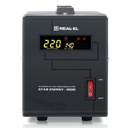 Стабілізатор напруги мережі REAL-EL STAB ENERGY-1000 призначено для забезпечення якісним і стабільним електроживленням різних споживачів в умовах великих за значенням та тривалістю відхилень напруги електричної мережі від номінальної, захисту пристроїв-споживачів від перевантаження, від дії високочастотних та імпульсних перешкод.