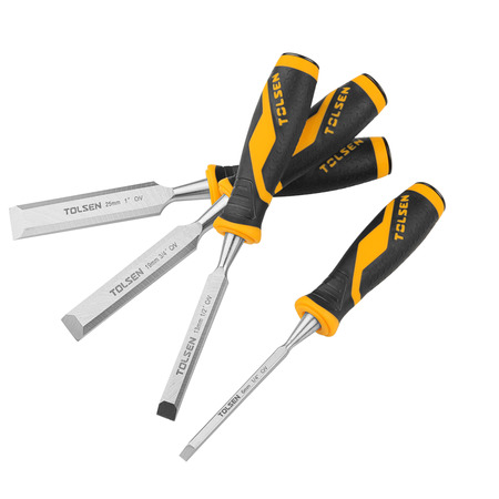 Стамеска Tolsen Профі - це набір інструментів, який включає в себе чотири стамески з різними розмірами: 6 мм, 13 мм, 19 мм і 25 мм. Кожна стамеска має довжину 125 мм і виготовлена з хром-ванадієвої сталі (CrV), що забезпечує високу міцність і тривалий термін служби.