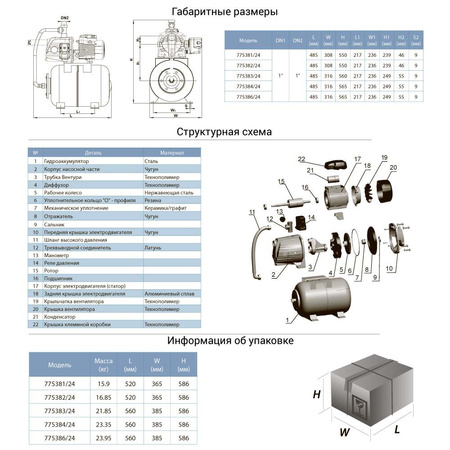 Станції водопостачання обладнані гідроакумулятором об'ємом 24 літра. Реле тиску управляє роботою електронасоса - настройка реле тиску Р (вкл) 1.4 бар/Р (викл) 2.8 бар . Станції призначені для перекачування чистої води і можуть застосовуватися: для побутового водопостачання, допоміжного обладнання, підйому води в трубопроводах високого і низького тиску, для зрошувальних систем садів і городів, теплиць і парників.