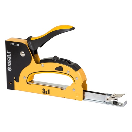 Незамінний при складанні меблів, укладанні килимового покриття, а також при фіксації утеплювача, обшивці м'яких меблів, багетних роботах. Універсальний інструмент, придатний для роботи зі скобами (6-14 мм), шпильками (14 мм) і цвяхами (14 мм). Повністю металева конструкція степлера з регулятором сили удару і гумова накладка на ручці сприяє зручній роботі зі степлером і тривалого терміну служби (не менше 100 000 ударів).