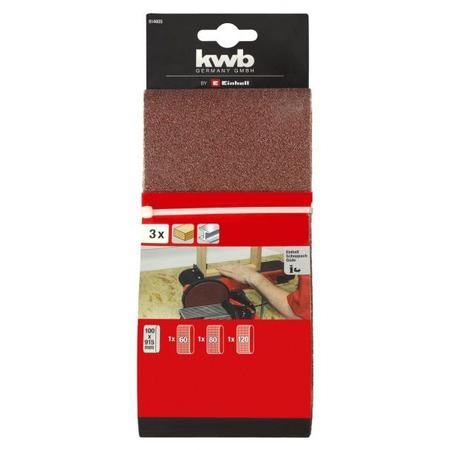 Стрічка шліфувальна Einhell KWB, 3шт, 100х915мм, К60, К80, К120 (914605) - це набір стрічок для шліфування, який включає в себе три різних шліфувальних стрічки з різними зернистостями. Розмір стрічок складає 100 мм в ширину та 915 мм в довжину. У наборі доступні стрічки з такими зернистостями: К60 (груба), К80 (середня) та К120 (фінальна).
