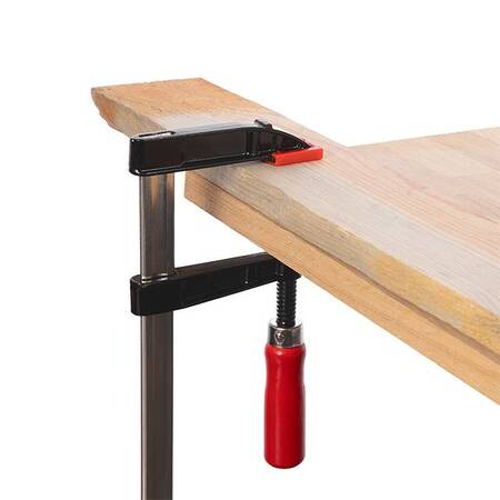 Основа виконана з міцної сталевої напрямної, ручка - дерев'яна. Завдяки пластиковому наконечнику на затискних губках гарантований захист деталей, що затискаються, від механічних пошкоджень, подряпин.