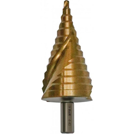 Свердло по металу S&R ступінчасте - призначене свердління та зняття фаски в металі та нержавіючій сталі. Свердло виготовлене із швидкорізальної сталі. Титанове покриття збільшує ресурс роботи свердл та забезпечує тривалий термін експлуатації. Має дві широкі спіралі для виведення стружки.